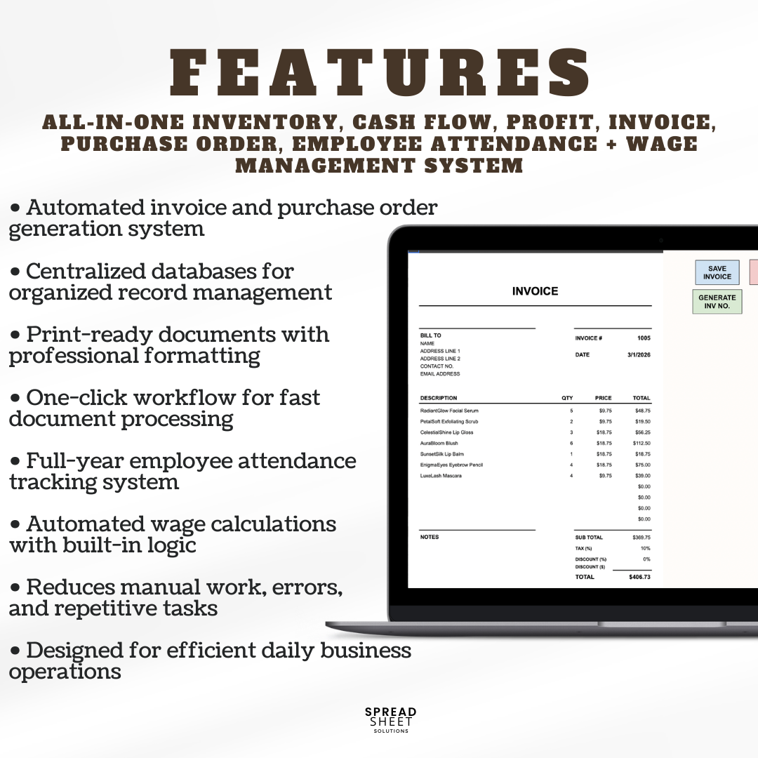 From inventory and sales to invoices, purchase orders, employee attendance, wage tracking, and financial reports β everything you need to run your business, all in one file.